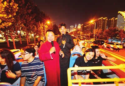 昨晚,夜幕初垂,古文化街东门南侧,一辆富有津味曲艺特色的双层观光巴士徐徐开动。二层敞篷车厢内,清脆的快板声划破暮色,相声演员李健生即兴抖出包袱:“今天各位可是来着了!咱这可是全国第一辆‘相声巴士’。”搭档薄浩文顺势接梗:“您看相声已有近两百年的历史了,从来没有一个相声演员在大巴车上说相声,咱这算开了先河了……”车厢内瞬间爆发的笑声,与海河两岸闪烁的霓虹交织共鸣。
