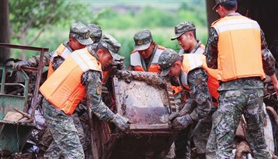 8月9日,武警甘肃总队官兵在兰州市榆中县马莲滩村、兴隆山村、新营镇、小康营乡、旧庄沟村等5个方向,展开转移被困群众、转运受损车辆、清理淤泥等任务。 新华社发