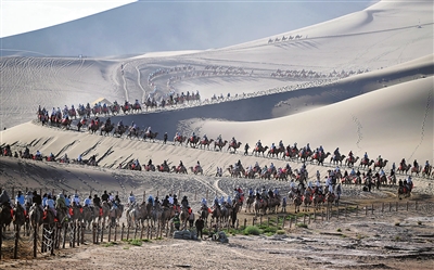 8月9日,游客在甘肃省敦煌市鸣沙山月牙泉景区游览。进入暑期以来,各地迎来旅游高峰。 新华社发