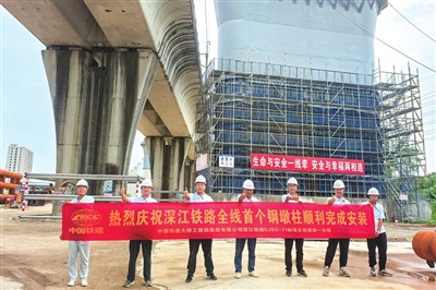 近日,由驻津央企中国铁建大桥局承建的深江铁路全线首个钢墩柱安装完成,为112米钢桁梁上跨既有广珠城际铁路施工奠定坚实基础。