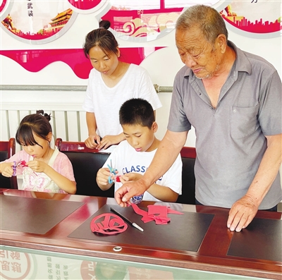 夏日悠悠,蝉声阵阵。宝坻区八门城镇杨岗庄村新时代文明实践站里欢声笑语,周边几个村的孩子们正在远近闻名的剪纸“达人”——杨岗庄村村民吕守元爷爷的耐心指导下,进行“我的家风”主题剪纸创作。