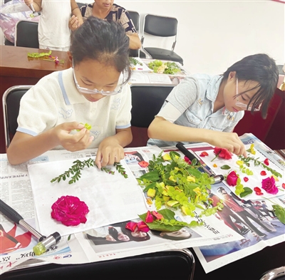 这样的互动在精武镇各新时代文明实践所(站)随处可见。在恒益隆庭社区的手工坊里,草木清香萦绕,孩子们手持小锤在布上轻敲新鲜的雏菊花瓣,花叶脉络渐渐浮现。“你看这叶子的纹路,像不像大自然画的画?”10岁的萱萱举着拓染作品,眼中满是惊喜。指尖与草木的互动中,孩子们触摸到传统文化的温度,人与自然和谐共生的种子也悄然播下。