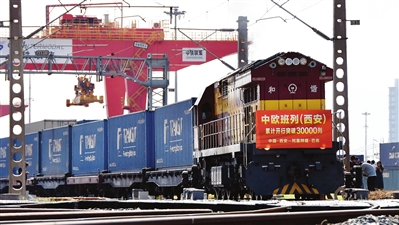 8月13日,满载着55个集装箱光伏组件的X9043次中欧班列从西安国际港站驶出,开往阿塞拜疆巴库,标志着中欧班列(西安)自2013年开行首列以来累计开行突破30000列,开行总量超过全国中欧班列累计开行总量的四分之一。西安国际港站也成为了全国首个中欧班列开行量突破30000列的车站,开行量、货运量、重箱率等核心指标位居全国第一。 新华社发