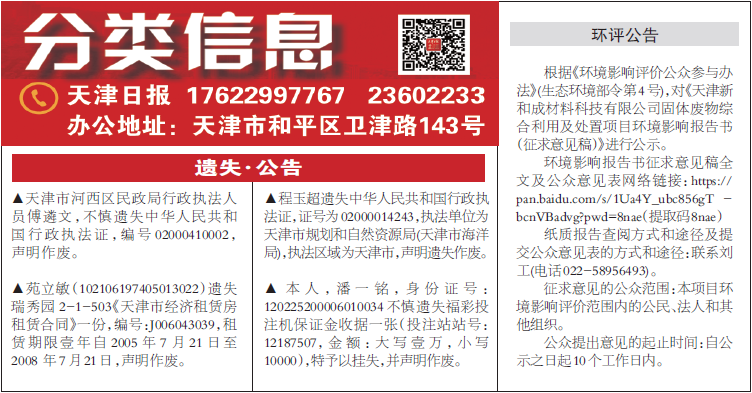 平媒总编室:022-23602716 中心办公室:022-23602888 海河传媒广告有限公司:022-23602233