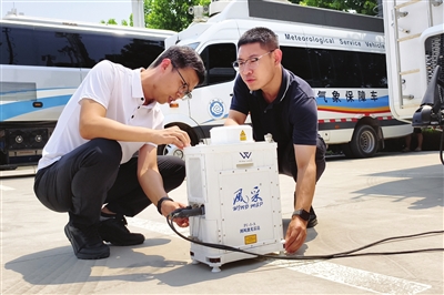 7月22日,记者在天津气象雷达研究试验中心办公楼前宽阔的场地上看到,工作人员正在对新安装的微波辐射计进行调试,李晓波介绍,这个横躺的白色圆柱形设备能够观测到站点上空的温度和湿度曲线数据,而包括其在内的垂廓设备则能对10公里高空大气参数进行连续“CT扫描”。他透露,在垂直气象观测领域,温、湿、风、水凝物等大气三维垂直观测要素监测站网密度如今也已缩短至41.35公里,时间分辨率更是提高至分钟级。