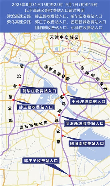 四、2025年8月31日15时至22时、9月1日7时至19时,津沧高速公路静王路收费站入口、前毕庄收费站入口,荣乌高速公路郭庄子收费站入口、团泊新城收费站入口、团泊南收费站入口、小孙庄收费站入口适时关闭。