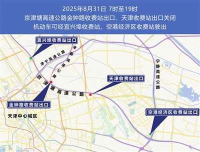 三、2025年8月31日7时至19时,京津塘高速公路金钟路收费站出口、天津收费站出口关闭。机动车可经宜兴埠收费站、空港经济区收费站驶出。