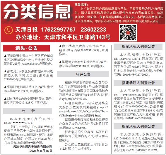 平媒总编室:022-23602716 中心办公室:022-23602888 海河传媒广告有限公司:022-23602233