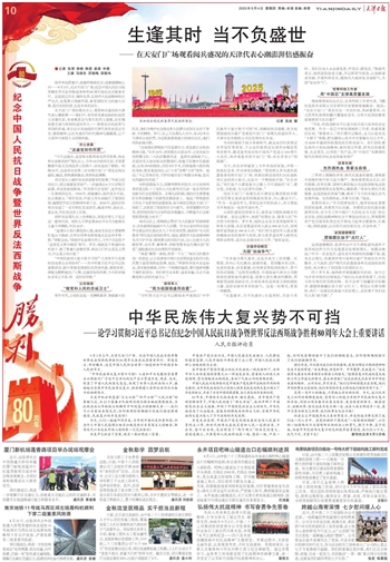 在天安门广场的观礼台上,观看阅兵盛况的天津代表心潮澎湃——他们中,有传承英雄血脉的抗战烈士亲属代表,有承载思念与荣光的烈士遗属,还有镌刻着忠诚与坚韧的退役军人……带着各自的故事与共同的赤诚,来自全市各战线的天津代表在此见证历史、感悟精神,让红色基因与时代精神交融激荡,让个人情怀与家国大义同频共振。