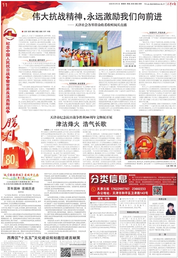 金秋九月,天安门广场旌旗如林,铁甲列阵。纪念中国人民抗日战争暨世界反法西斯战争胜利80周年阅兵盛典,以举世瞩目的雄姿,在中华大地上镌刻下又一个历史性时刻。电波所及,海河两岸热血沸腾。从社区到乡村、从机关到高校、从企业到军营,天津社会各界群众收看收听阅兵直播,共赴这场跨越时空的精神之约。当80响礼炮在首都上空响彻云霄,当受阅方队踏着铿锵步伐走过天安门广场,当先进武器装备携雷霆之势驶过长安街,津沽大地的每一个角落,都激荡着同一种情感——那是对英烈的深切缅怀、对和平的无比珍爱、对祖国的万丈豪情。