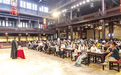天津戏剧博物馆(广东会馆)变身非遗“欢乐场”,古老雕梁与鲜活表演交融。 记者 胡凌云 摄