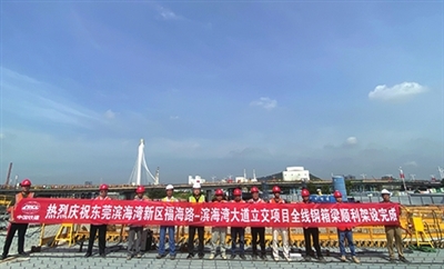 9月30日,由驻津央企中国铁建大桥局承建的东莞滨海湾新区福海路-滨海湾大道立交项目钢箱梁架设全部完成。