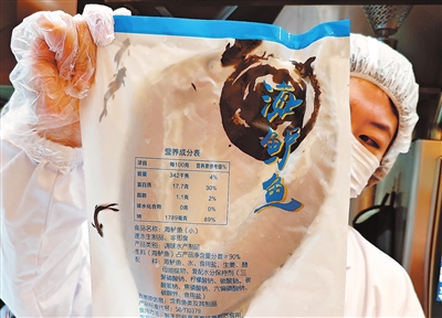 “葱香烤鱼”是西贝的热门菜品之一,售价89元。其包装袋上的配料表显示,除鱼和水之外,还有三聚磷酸钠、柠檬酸钠、碳酸钠等一长串食品添加剂。