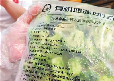 冷藏柜中,多款带有塑料包装的食材保质期较长。如包装好的海鲈鱼,保质期为18个月;番茄莜面酱保质期为12个月;馕饼冷冻生坯保质期为12个月;注明“儿童餐”的蘑菇汤料,保质期为9个月;500克“有机速冻西兰花”保质期为24个月。
