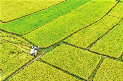 10月17日,在湖南省永州市道县梅花镇梅花村,水稻种植大户采用大型机械收获稻谷(无人机照片)。