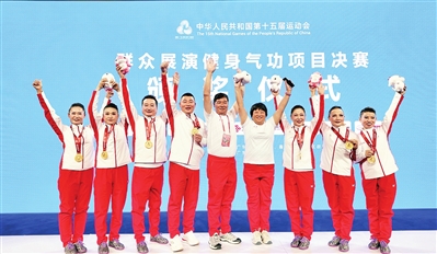 天津静海队在第十四届全运会上就曾夺得该项目的冠军,此次能够成功卫冕,离不开队员们日复一日地刻苦训练与默默付出。据教练马骜介绍,这支队伍的成员有教师、企业职工、退休职工……为了备战本届全运会,大家在天津市健身气功协会的专家指导下已经在一起训练了两年多。由于队员来自各行各业,为了协调彼此的时间,训练常常安排在清晨6点到9点和下午4点到7点的业余时段,周末和节假日也不例外。站在领奖台上,教练马骜不禁感慨道:“我心里最热的不是这块沉甸甸的金牌,而是看着队员们一起高举奖牌时,那种集体努力后功到自然成的踏实感。”马教练说,这支由6名队员组成的队伍,心中始终怀揣着为天津荣誉而战的共同信念。正是这份坚定的使命感,让他们将6人之力拧成一股绳,形成了强大的团队凝聚力。