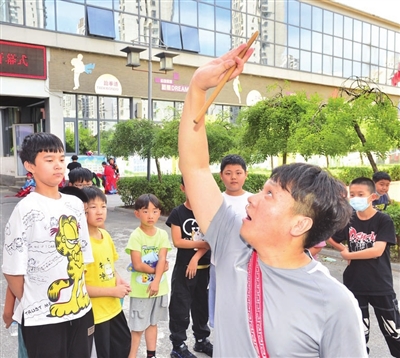 张勇:王浩然是2004年出生,12岁跟随我学习高跷,如今掌握了武棒的技法,扮演武松打棒角色,他擅长表演双飞燕棒法,其“单腿飞燕”增加了表演的难度;李凯宇是2008年出生,8岁时跟随我学习长祥高跷的武棒技法,他对组合棒有研究,擅长打“双背剑”“浪子踢球”等棒法;李俊浩是2010年出生,8岁跟随我学习长祥高跷青杆技法,抖起青杆闪展腾挪,他将蝴蝶抖得上下飞舞,非常精彩。