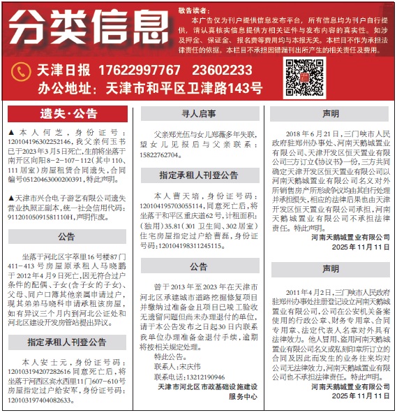 天津日报所有作品,版权均属于天津海河传媒中心,受《中华人民共和国著作权法》的保护。所有关于天津日报内容产品的数字化应用,包括但不限于稿件签约、网络发布、转稿等业务,均需与天津海河传媒中心商谈,与天津海河传媒中心有互换稿件协议的网站,在转载数字报纸稿件时注明“来源-天津海河传媒中心天津日报”和作者姓名,未与天津海河传媒中心有协议的网站,谢绝转稿,违者必究。