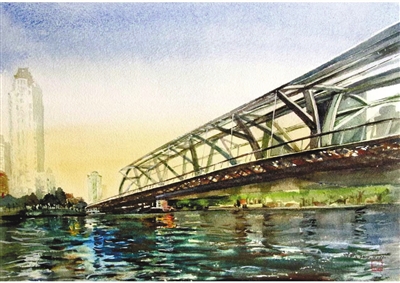我的这幅水彩作品,以仰视构图在画面中聚焦海河上的进步桥,既凸显了其组合钢结构的工业质感,也传达出其“飞驰列车”“跃水飞鱼”的双重意象。进步桥是一座自锚式桁吊组合钢结构桥,采用全焊工艺,共有33节钢箱梁,桥梁总长180米,全桥宽度30.7米,2007年10月建成通车。