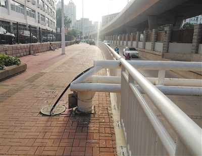 近日,有市民向天津日报热线23602777反映,河北区中山路天津市第四中心医院门前北站南地道入口处设置的限高架,其基桩固定在人行道上,占压了部分人行道,周围没有设置明显的警示标识,影响行人正常通行,还存在行人被绊倒的安全风险。
