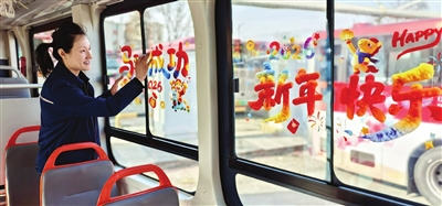 本报讯(记者 苏晓梅 摄影 张磊)元旦即将到来之际,公交司机为车辆换上“新年皮肤”。记者昨天从天津公交第一客运公司获悉,全国劳动模范、5路驾驶员石霞用巧手将8米车厢装扮一新,为市民游客营造喜庆的节日氛围。