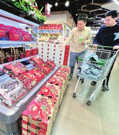 连日来,大量进口车厘子在我市各大超市及水果店新鲜上架,吸引众多市民选购。