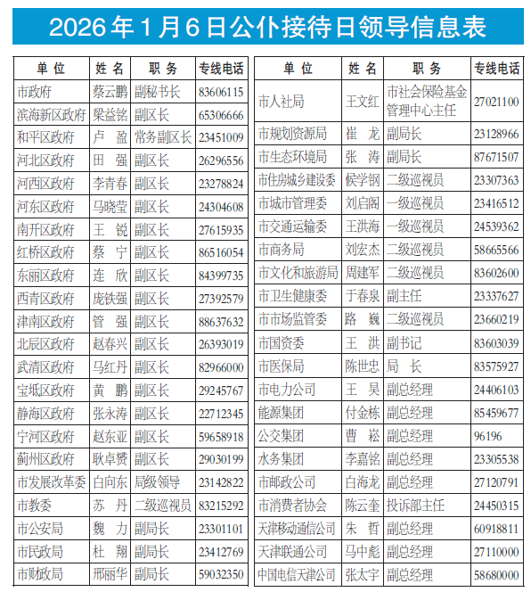 本报讯(记者 高立红)1月6日是全市“公仆接待日”活动时间,当天9:00—11:30,全市43个单位的相关负责同志将在各自单位接听热线电话,为群众解答相关政策,听取大家意见建议。鉴于活动期间拨打热线电话的市民较多,如遇到占线请您不要着急,您还可以选择随时拨打“天津12345政务服务便民热线”进行咨询、求助、投诉、举报和提出意见建议。已进入诉讼、行政复议、信访复查复核等法定程序的事项不在“公仆接待日”活动的受理范围,请您支持理解,并把宝贵的时间留给更多市民朋友。