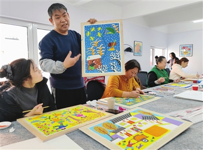 在北辰区双口镇后堡村,一座古朴的木结构院落——北辰农民画大院的画室里欢声笑语不断,“你这画的鱼比鹅还胖,怎么喂的?”“老太太在苹果树上跳舞呢!”……北辰农民画家、全国首批乡村工匠名师丰爱东看着初级班的学员们互相点评画作,也跟着笑起来:“这就对喽!咱们农民画就是得有意思!”