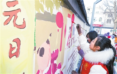 日前,和平区南市街道裕德里社区的闲置区域被打造成休闲空间,学生在这里开展主题墙绘活动,扮靓社区。 记者 吴迪 摄