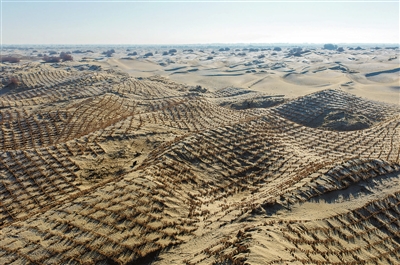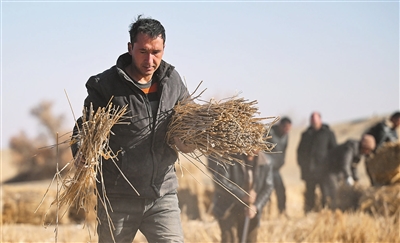 寒冬时节,尽管塔克拉玛干沙漠南缘的新疆和田地区墨玉县气温跌破零摄氏度,这里却涌动着治沙攻坚的热潮。数十台推土机轰鸣作业,推筑阻沙堤、平整沙丘,本地农户忙着收割加工芦苇、铺设草方格,冬季治沙工程高效推进。