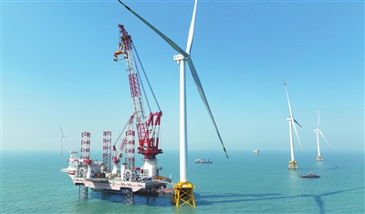 1月13日,由三峡集团与金风科技联合设计建造和示范应用的20兆瓦海上风电机组在福建闽南海域完成吊装。该机组的成功吊装,是我国海上风电大容量机型应用的又一重要突破。 新华社发