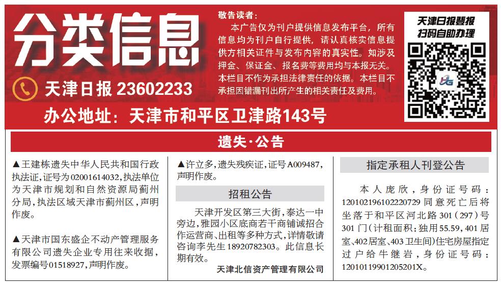 天津日报所有作品,版权均属于天津海河传媒中心,受《中华人民共和国著作权法》的保护。所有关于天津日报内容产品的数字化应用,包括但不限于稿件签约、网络发布、转稿等业务,均需与天津海河传媒中心商谈,与天津海河传媒中心有互换稿件协议的网站,在转载数字报纸稿件时注明“来源-天津海河传媒中心天津日报”和作者姓名,未与天津海河传媒中心有协议的网站,谢绝转稿,违者必究。