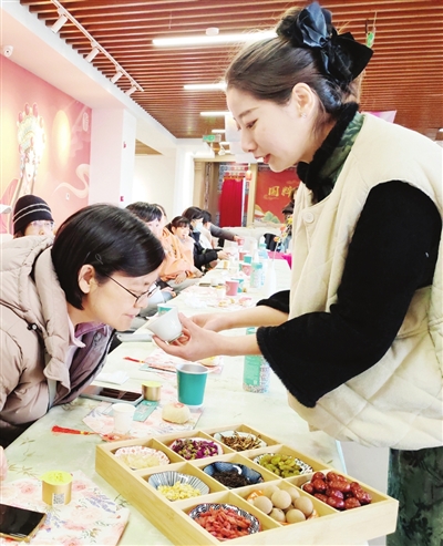 带着10岁女儿前来的陈瑶听得格外认真。“以前买‘八件’,只知道问‘什么馅’。”她对记者说,“今天才知道,选形状就是选祝福。给爷爷奶奶选‘寿’字,给备考的弟弟选‘状元饼’。”她的女儿赫陈煖则被腊八茶吸引,她说:“妈妈,这个茶有枣的甜味。”该茶来源于区级非物质文化遗产代表性项目元祥鸿记茉莉花茶窨制技艺,品牌总经理范佰卿说:“我们在茉莉花茶的基础上,加了红枣、枸杞、陈皮等8种配料调配而成,喝起来暖身也暖心。”