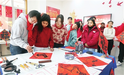 图为天津医科大学组织中外师生一起书写福字、对联。