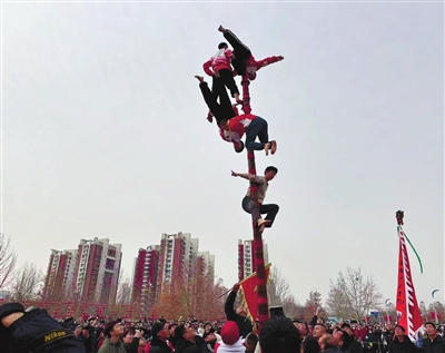 “倒香炉!”突然,人群里传出一声吆喝,有懂行的老人喊道,这可是大六分村登杆的看家绝活儿。