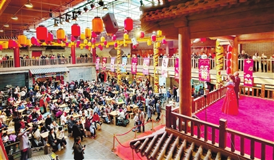 园区内各大民俗表演准时登场,古彩戏法格外吸睛,孩子们挤在前排,随着戏法变幻,发出阵阵惊叹。年轻人身着古风服饰漫步打卡,红灯笼下、文化墙前,定格下一个个瞬间。文创区内,年画周边受青睐,成为游客带回家的新春纪念。
