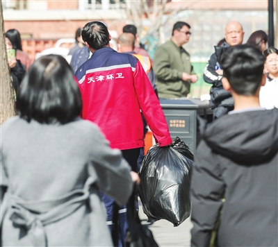 “民园1920街区”游客络绎不绝,环卫工人闫建(中)每天从早8时到晚9时坚守岗位,不间断巡查。 记者 吴迪 摄