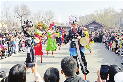 春节假期,北宁公园举办新春游园会,踩高跷、舞龙舞狮等民俗表演吸引游客目光。