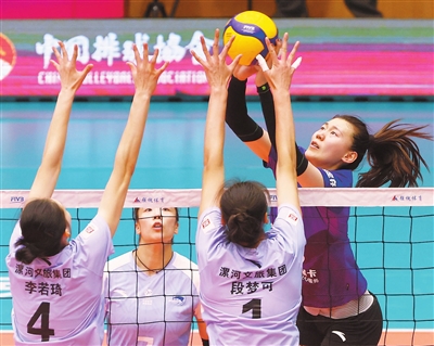 本报讯(记者 申炜 摄影 崔跃勇)昨晚,女排超级联赛季后赛进行第3轮比赛,坐镇主场的天津渤海银行女排迎战河南女排。在先失一局的情况下,天津女排连扳3局,最终以3:1(24:26、25:15、25:18、25:20)逆转对手,拿到季后赛首胜。
