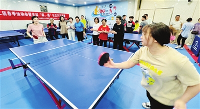 昨天,红桥区水木天成第三社区工会联合会,联合辖区体育公司和快递企业开展第二届春季运动会暨首届“闻、逸”社区乒乓球赛。 本报记者 刘欣 摄