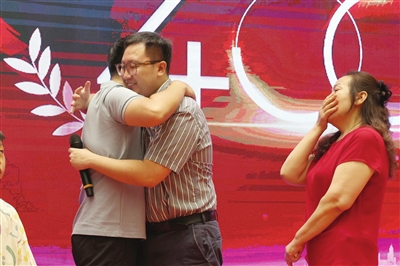 昨天上午,在天津市红十字事务中心主办的“津生相‘髓’ 400新起航”造血干细胞捐献主题宣传活动上,专程从江苏省徐州市来津的石书畅及家人,终于见到了朝思暮想的救命恩人——我市第254例造血干细胞捐献者齐天南,两位同龄人紧紧抱在一起。