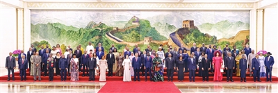 出席论坛峰会的51个非洲国家元首、政府首脑及配偶,2位总统代表,非盟委员会主席和联合国秘书长等贵宾陆续抵达人民大会堂。习近平和彭丽媛热情迎接,同他们分别握手问候,并集体合影留念。