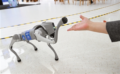图 3月26日,一款宇树Go2机器狗在中关村国际创新中心与人互动。 新华社发