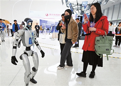 图 3月26日,中关村国际创新中心的一款正在行走的宇树G1机器人吸引人们拍照留影。