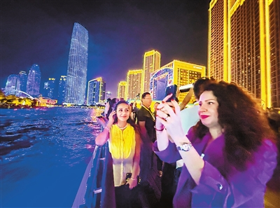 昨晚,参加上合天津峰会的媒体记者乘船参观海河沿线。