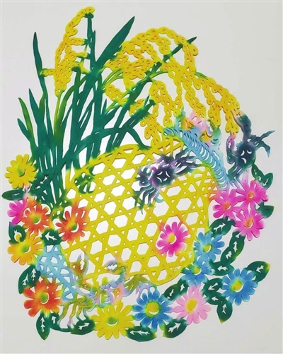 目前我已正式将杨村六街彩色剪纸技艺传授给一位叫闫海荣的老师,她也成了杨村六街彩色剪纸第四代传人。在闫海荣与我学习的九年时间里,她一直十分刻苦,虽然她的本职工作是一位英语老师,但她对美术一直很感兴趣,也自学了很多相关的知识。彩色剪纸最难的就在于染色这一步,需要具备一定的美术功底才能将色彩搭配和谐,并且过渡自然。为了让自己的技艺更加精进,闫海荣自学了国画等绘画技术,如今她的彩色剪纸个人作品越来越精美,并且多次参展并获得国家级、市级、区级等奖项,她的部分作品还被武清区博物馆收藏且在十余本书籍刊物中出版。她指导学生的集体作品和个人作品也数十次获得市区级奖项。闫海荣还多次参加本地区以及京津冀通武廊的剪纸交流活动和公益活动,个人原创剪纸作品深受当地民众喜爱,颇具影响力。