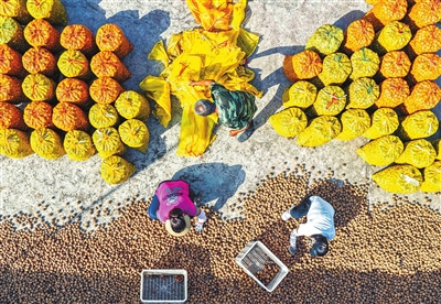 图 9月8日,河北省遵化市合丰农产品专业合作社的社员,在场院包装晒干的核桃(无人机照片)。 新华社发