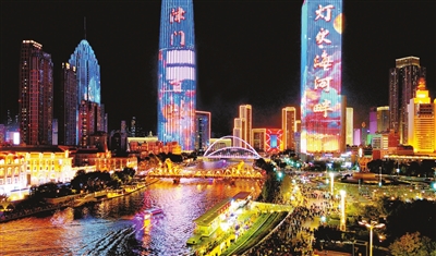 国庆假期,海河两岸灯火辉煌,迷人夜色吸引众多游客。 记者 钱进 摄
