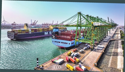 而在不远处的天津港太平洋国际集装箱码头,同样是一番热火朝天的景象。往来地中海沿岸、欧洲国家的3条20万吨级集装箱货轮集中抵达,码头作业资源齐备,50多个小时便完成了20356标准箱的集装箱作业。