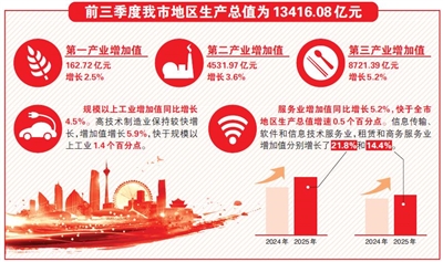此外,服务业增加值增速连续6个季度快于全市地区生产总值增速,今年前三季度增长5.2%,占比65.0%,同比提高1.3个百分点。现代服务业增长较快,信息传输、软件和信息技术服务业,租赁和商务服务业增加值分别增长21.8%和14.4%。